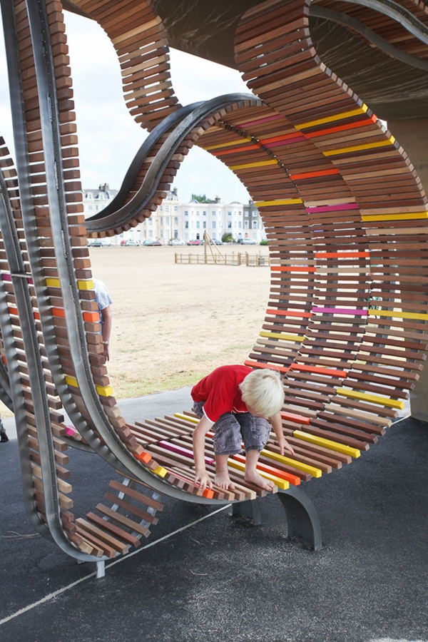 這是由Studio Weave設(shè)計(jì)的The longest bench,位于Littlehampton海濱,于2010年7月30完工。沿著蜿蜒的軌道,利用100%回收的熱帶硬木板,制造出這個(gè)富有魅力的旋轉(zhuǎn)環(huán)繞的長(zhǎng)椅。